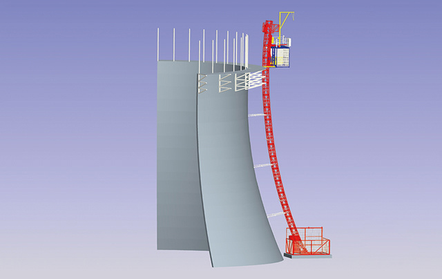 該機廣泛應用于煙囪、冷卻塔、橋梁等建筑工程。升降機導軌架特殊處理,可曲線、斜線布置。采用浮動調平機構保證升降機沿曲線、斜線運行時,吊籠始終保持水平。導軌架為直線時,該機也可作為直線升降機使用。